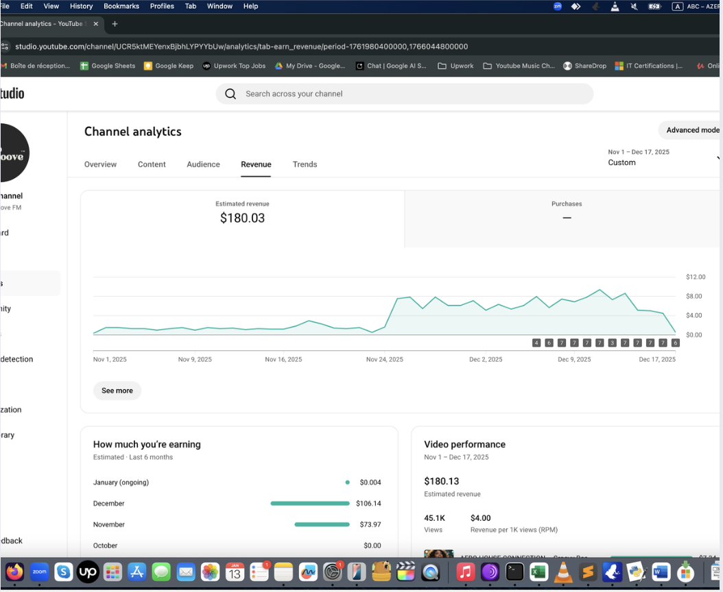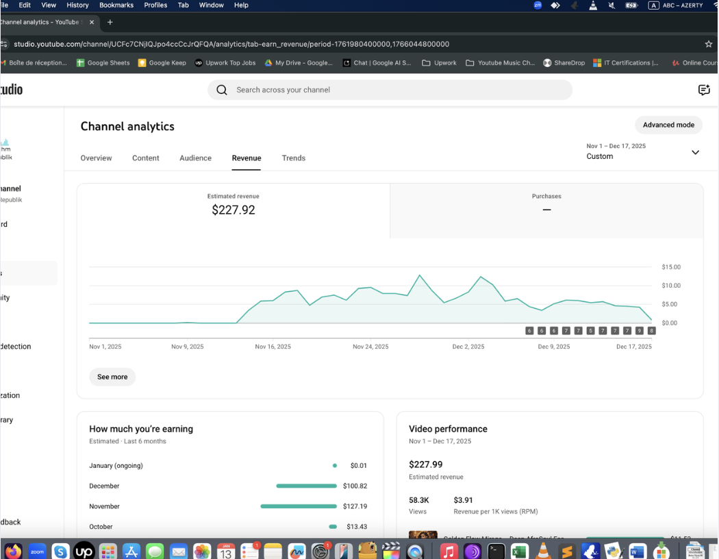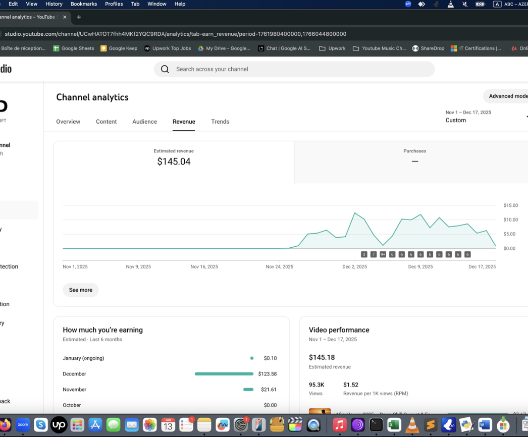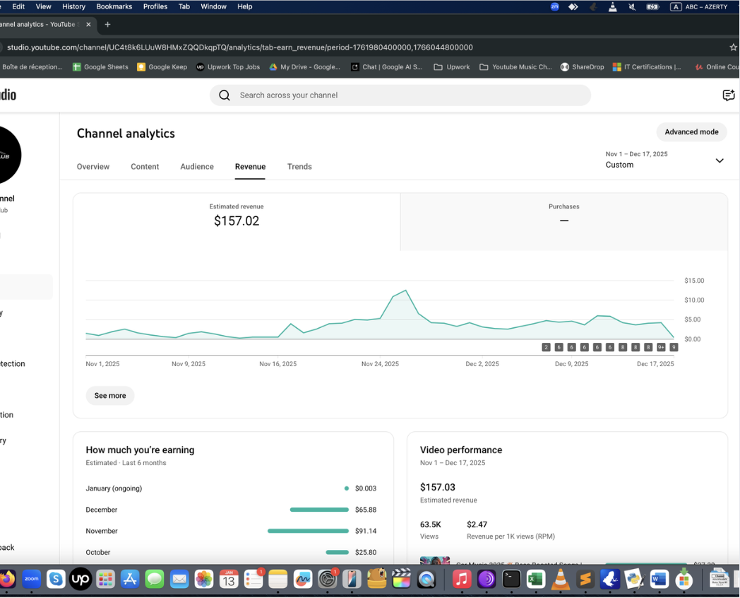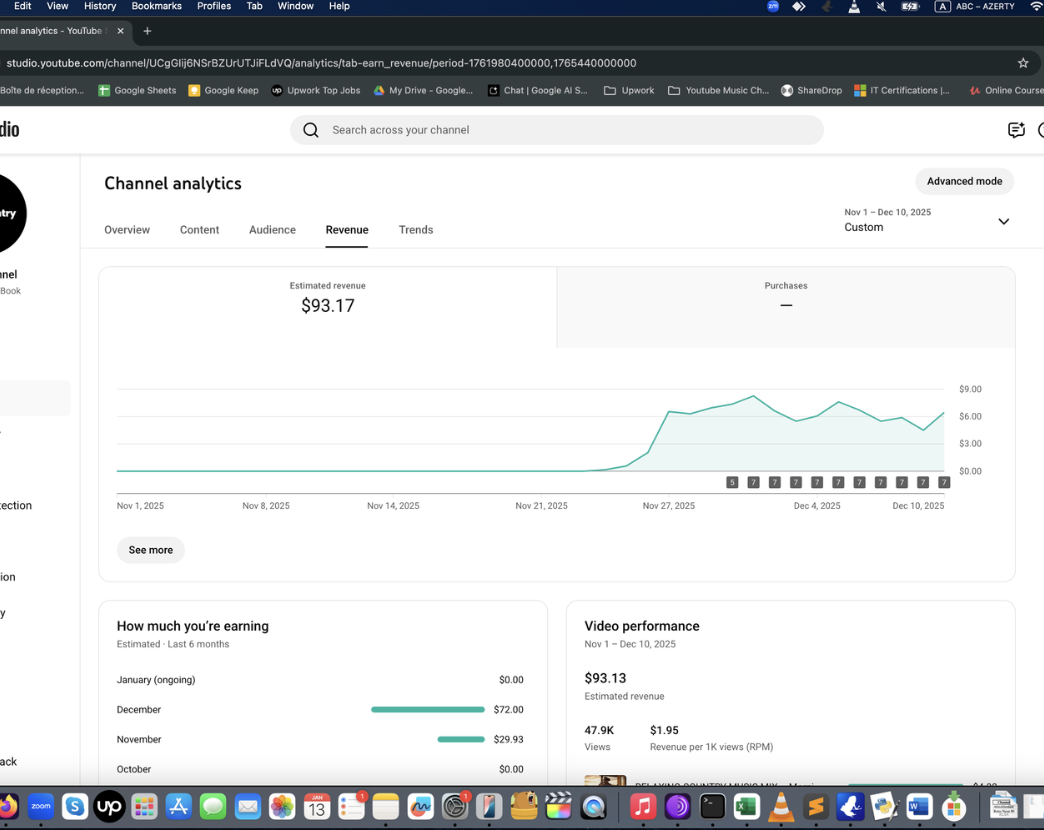 Ayda 0-400 dolar arası kazanan örnek Müzik Otomasyonu panel görüntüleri aşağıda. Bunlar sadece birer deneysel örnektir. Gördüğünüz gibi, kanalın gelir durumunu öngörmek mümkün olmuyor. Başlayıp, görmek gerekiyor. Bu bir pasif gelir değildir, niş seçmeniz ve video üretip yüklemek için bilgisayarınızda yazılımı ayda bir çalıştırmanız gerekir.